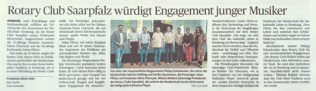 Seit über 20 Jahren unterstützt der RC Homburg-Saarpfalz Schüler der Musikschule Homburg und zeichnet sie mit einem Förderpreis sowie einer Urkunde aus. In diesem Jahr wurde der Preis von 1500 € geteilt. Anastasia-Maria Chernyak (15) und Julian Pfitzer (38, blind) erhielten beide die Auszeichnung, die Präsidentin 2024/25 Bibiana Bellaire überreichte. Anastasia-Maria überzeugte durch ihr virtuoses Klavierspiel, und Julian gab ein Konzert auf dem Keyboard mit einigen Popsongs zum besten, die er sensibel und gekonnt präsentierte. Carola Ulrich, die Leiterin der Musikschule, sowie die beiden Lehrer, Valerian Helbling und Steffen Buckmann, waren ebenso stolz wie ihre Schüler. Die Stadt Homburg vertrat der erste Beigeordnete Philipp Scheidweiler. Bericht in der SZ vom 4.9.2025